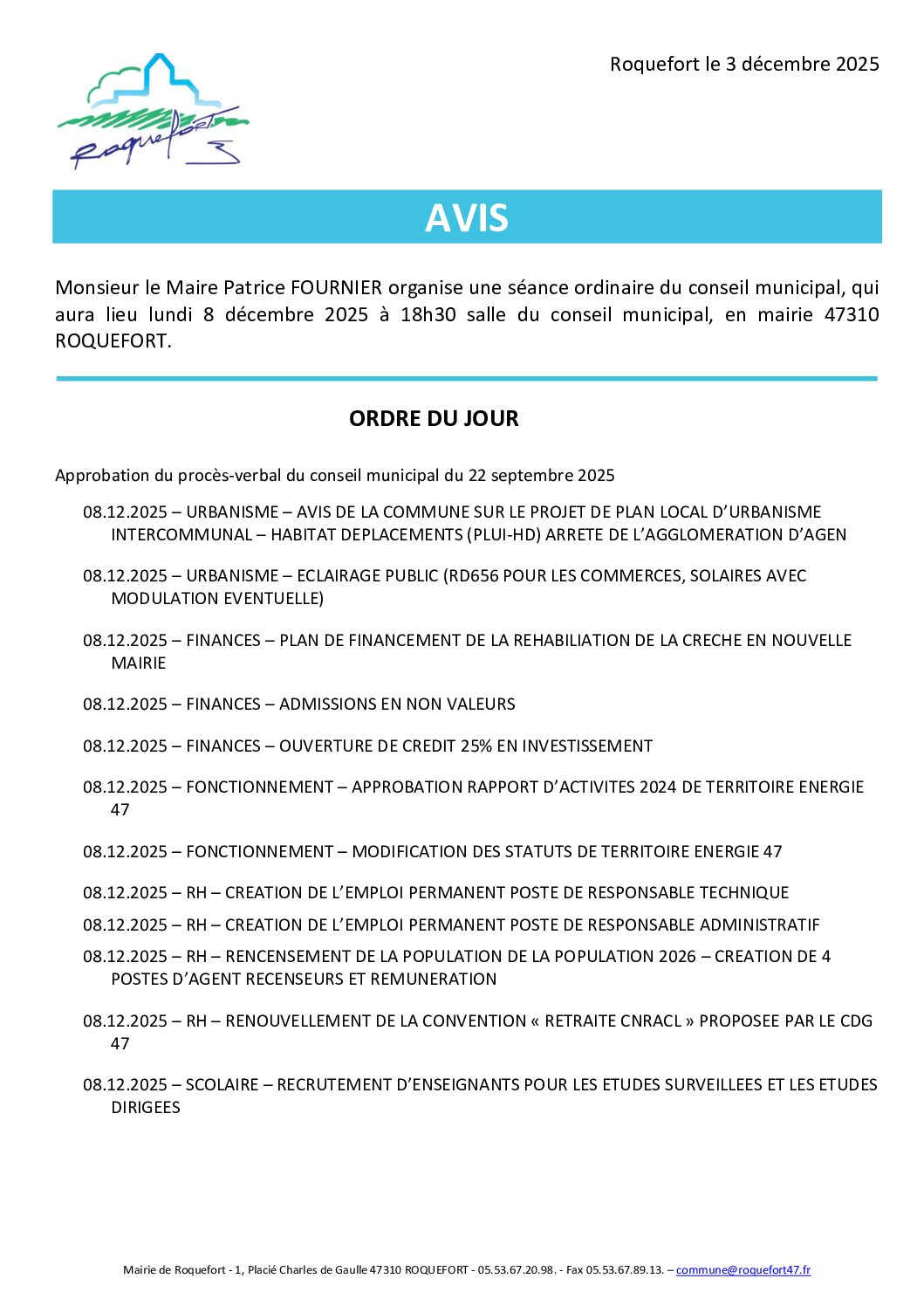 Monsieur le Maire, Patrice FOURNIER, organise une séance ordinaire du conseil municipal le lundi 08 décembre 2025 à 18h30 dans la salle du conseil municipal à la Mairie, 1 placié Charles de Gaulle 47310 Roquefort