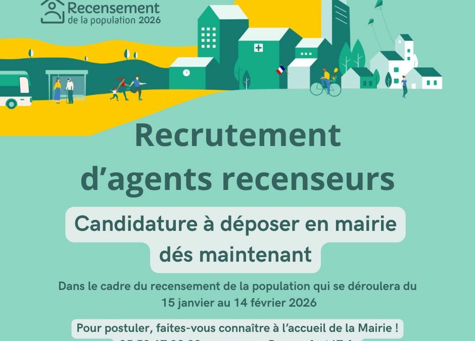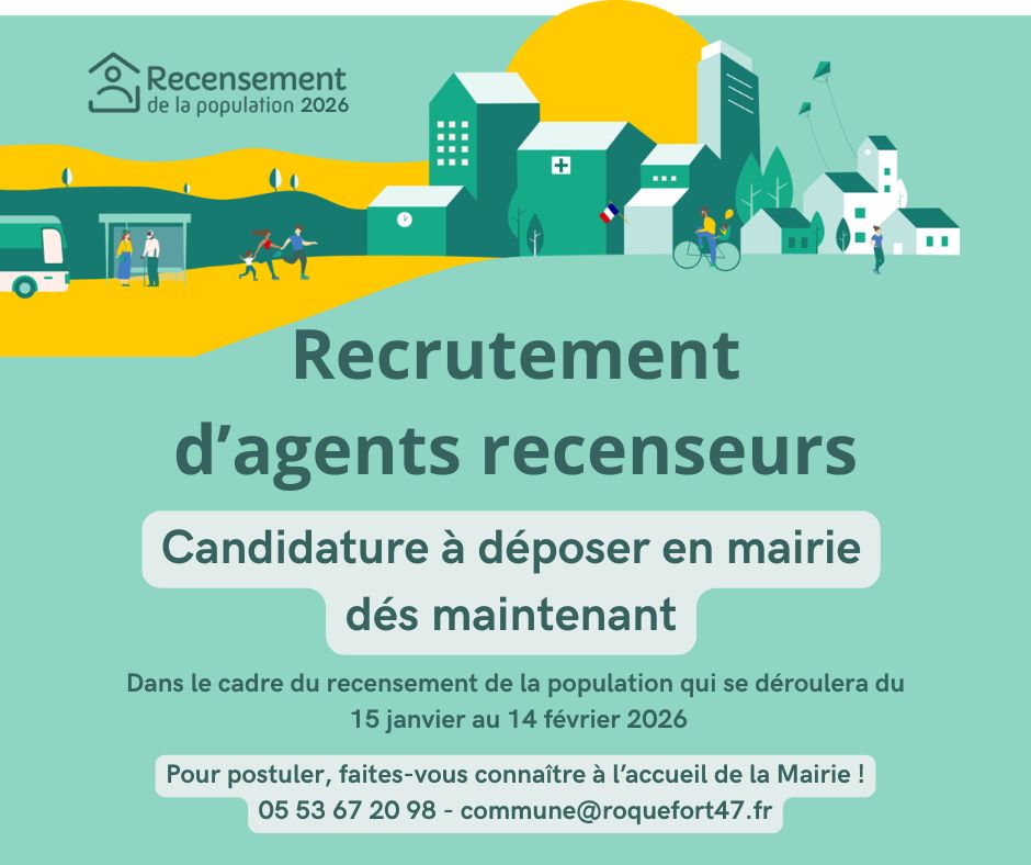 Dans le cadre du recensement général de la population qui se déroulera du 15 janvier au 14 février 2026, la commune de Roquefort recrute ses agents recenseurs.